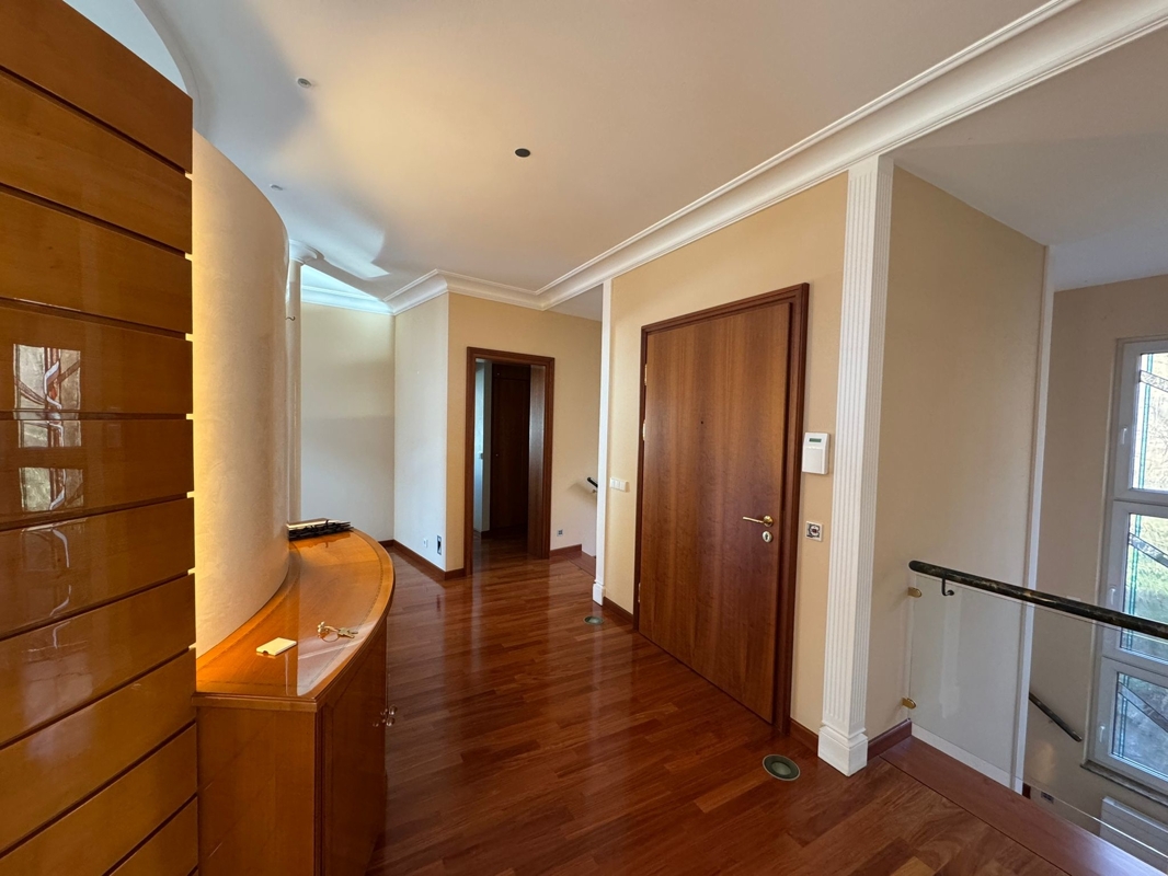 - Schlafzimmer: Die beiden Hauptschlafzimmer sind mit eigenen Ankleiden ausgestattet und bieten Zugang zu einem luxuriösen Masterbad mit Badewanne, Dusche und Sauna, abgetrennt durch eine stilvolle Ornamentglastür.