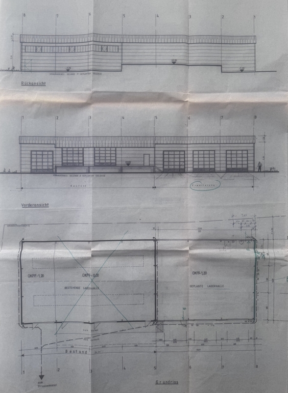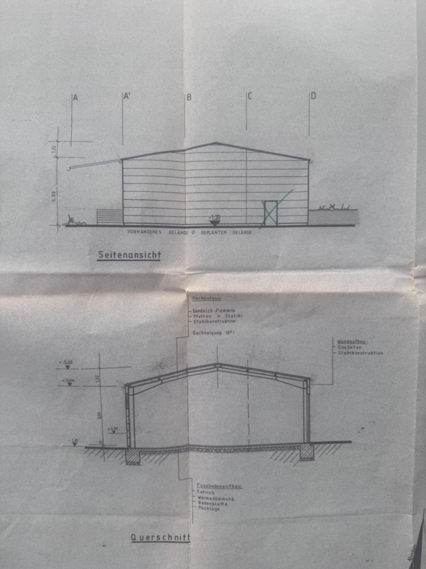 Die Halle mit ca. 640 m² ist derzeit voll vermietet, die Mieteinnahmen können auf Anfrage mitgeteilt werden. Der mittlere Gebäudeteil besitzt eine vorgelagerte Rampe. Dieser Teil ist ca. 270 m² groß. Das Gebäude ist mit Rolltoren die mit Elektroantieb ausgestattet sind .In dem linken Teil der Halle befindet sich eine LKW-Montagegrube.