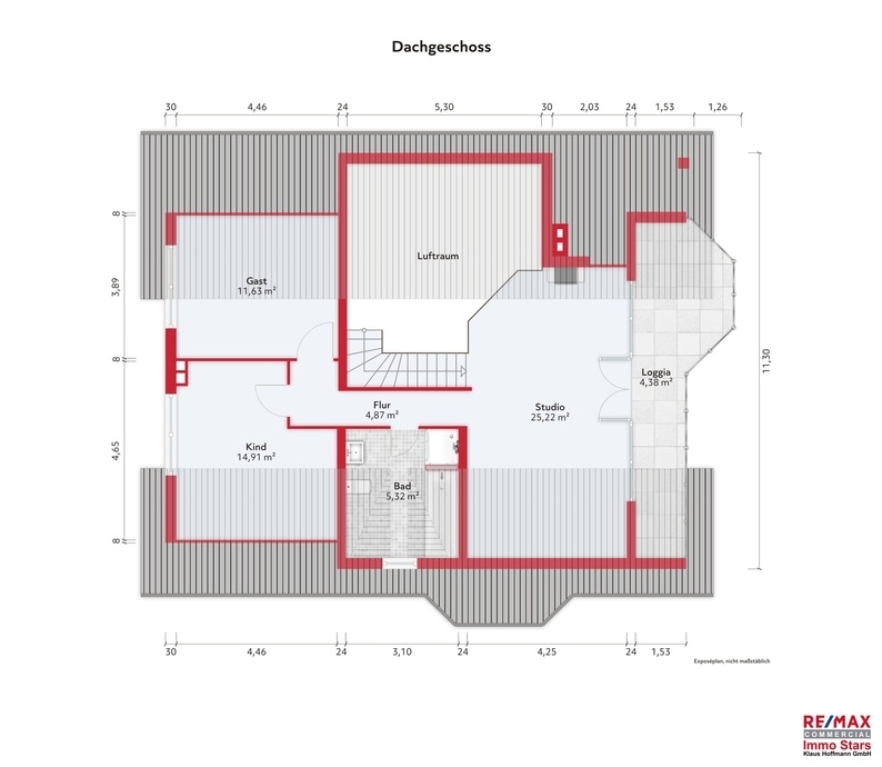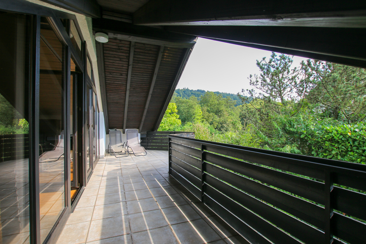 Die imposante Galerie könnte man ganz kurz so beschreiben: Traumhaft! - Ein großer, luftiger Raum, lichtdurchflutet durch den verglasten Giebel, davor die große Loggia, helle Decken-Paneele bis zum First, dazu Stäbchenparkett am Boden... - Einen schöneren Arbeitsbereich kann man sich nicht wünschen! Ein Flur führt zu einem Badezimmer, das mit Wanne und Dusche ausgestattet ist, und es stehen noch zwei Räume zur Verfügung, die als Gäste-, Kinder- oder Hobbyzimmer genutzt werden können.