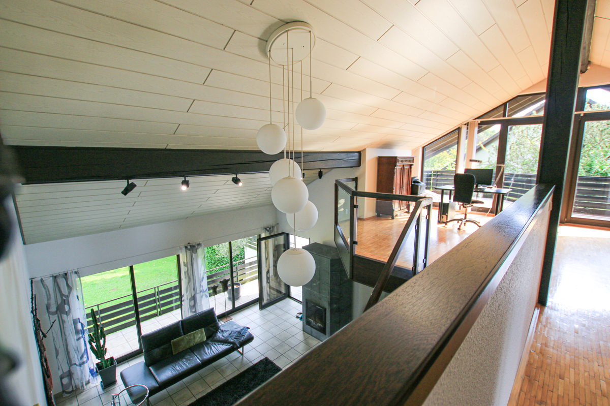 Eine durchgehende Blickachse, ausgehend von der Haustür, weist den Weg zum Wohn-/Esszimmer und weiter zum Balkon und in den Garten. Der L-förmige Wohn-/Essbereich lässt staunen, denn dieser ist wirklich außergewöhnlich und repräsentativ! Links lässt der offene, verglaste Treppenaufgang zur Galerie und bis zum First blicken, geradeaus geben die großen Fensterelemente den Blick in's Grüne frei und rechts befinden sich der verglaste Speckstein-Heizkamin sowie der Zugang zum Balkon. Vor dem Kamin, auf der rechten Seite, führt ein Bogen-Durchgang zum sechseckig gestalteten Essbereich, welcher auf der einen Seite zum Balkon bzw. zum Garten und auf der anderen Seite direkt zur Küche führt. Diese verfügt u. a. über Granit-Arbeitsplatten, Rückwandverkleidungen, eine Insel-Esse und einen separaten Vorratsraum.