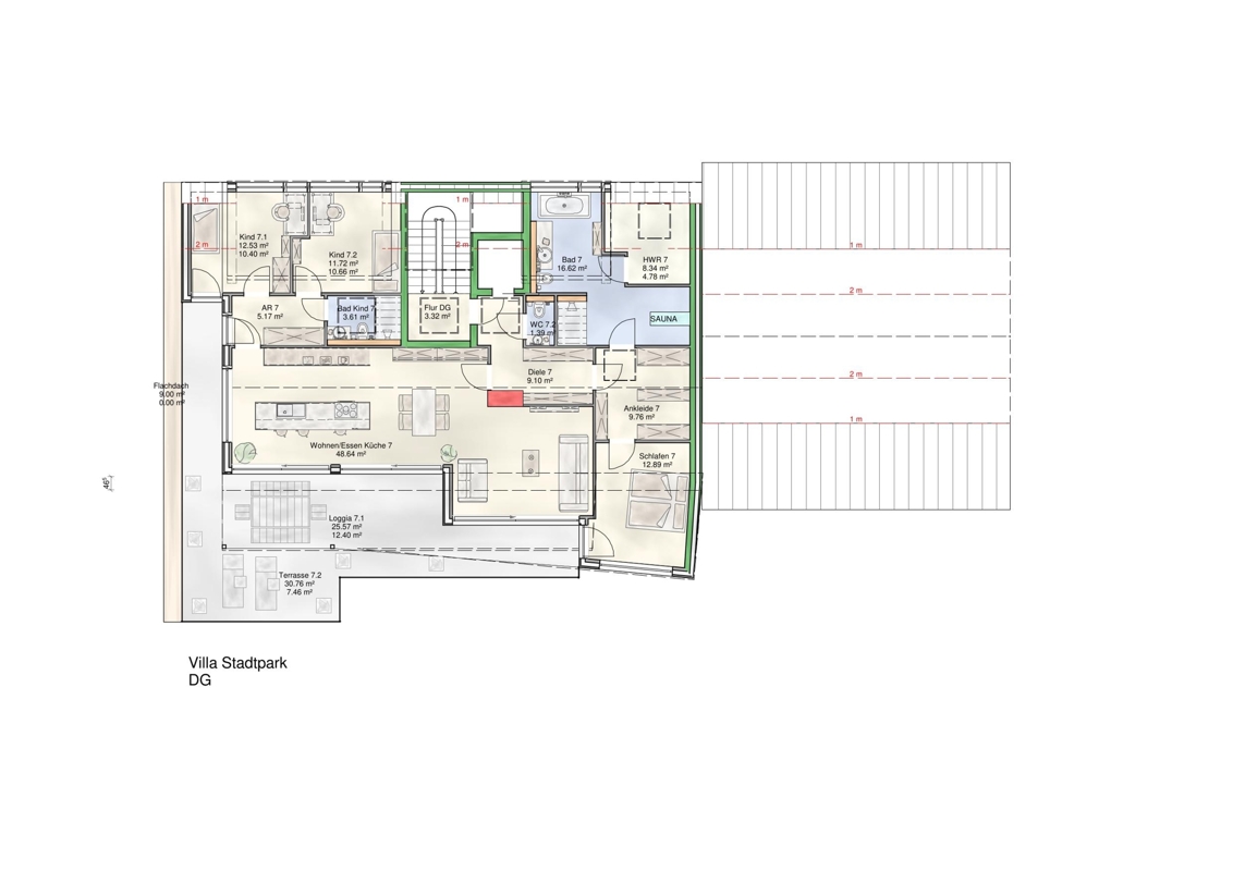 Die Penthouse-Wohnung bietet ca. 153 m² Wohnfläche, aufgeteilt in 5 Zimmer, 2 Bäder, ein Gäste-WC, ein Ankleidezimmer, einen Hauswirtschaftsraum und einen ca. 56 m² großen Balkon, teilweise überdacht. Anschlüsse für eine Sauna sind vorhanden!