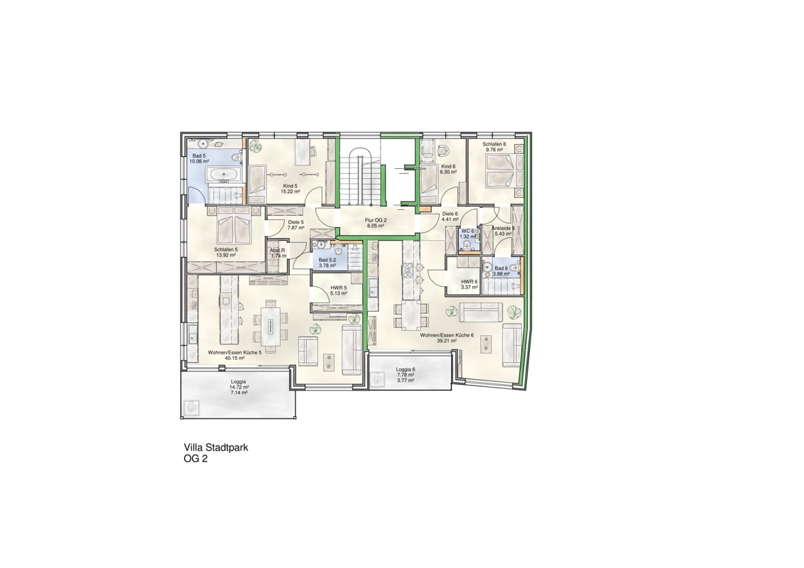 Der offene Wohnbereich erstreckt sich über ca. 39 m² und einen direkten Terrassenzugang. Das Ankleidezimmer bietet großzügige Kleiderschrankflächen, der Hauswirtschaftsraum ausreichend Stauraum und techniknahe Voraussetzungen.