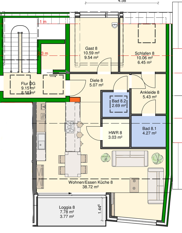 Der direkte Zugang zur Penthouse-Wohnung erfolgt barrierefrei über einen Aufzug, der Sie direkt in die Wohnung führt.