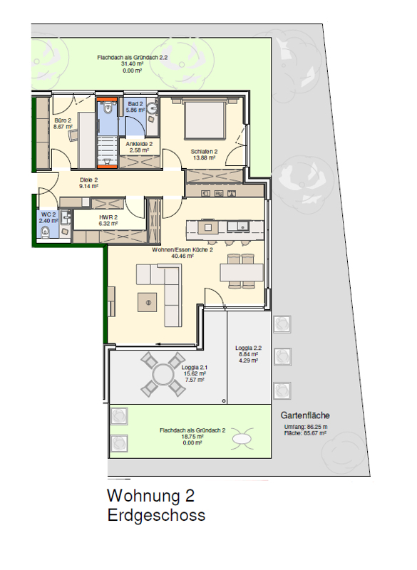 Die Neubau-Wohnung im Erdgeschoss bietet ca. 99m² Wohnfläche, aufgeteilt in 3 Zimmer, 1 Badezimmer und 1 separates WC, einen Hauswirtschaftsraum und eine Loggia, teilweise überdacht.