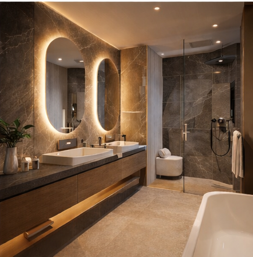 In den Bädern können Wände mit großformatigen Fliesen oder auch großformatige fugenlose Platten gewählt werden.