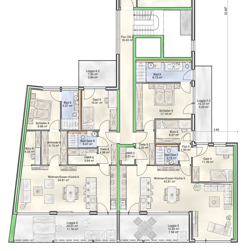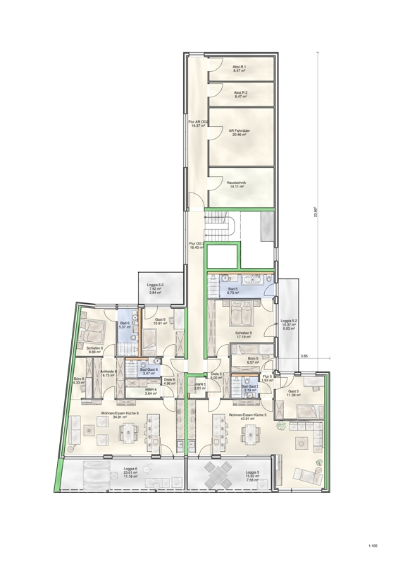 - Ökologischer Holzbau- Die Außenwände werden mit einer hochwertigen vorgehängten, hinterlüftenden und nahezu sanierungsfreien Fassade ausgeführt