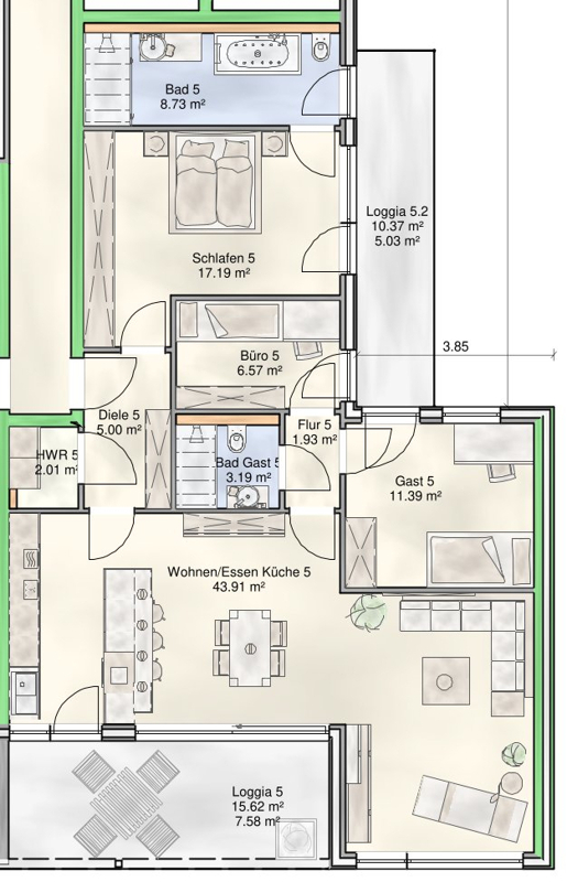 Es besteht die Möglichkeit, Materialien, Bad-Design, Küchenlösungen und Grundrisse individuell an Ihre Wünsche anzupassen, abhängig vom Baufortschritt und den Bauträgerbedingungen.