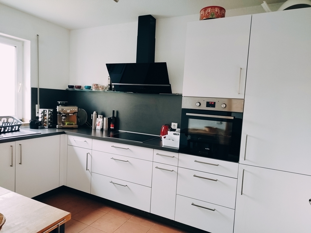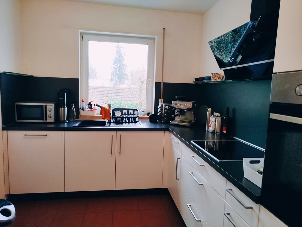 Das Ende der Diele führt in das geräumige Wohn-/Esszimmer. Hier ist rechts die Küche angeschlossen, die mit einer top-modernen Einbauküche ausgestattet ist und u. a. mit hochgesetztem Backofen, vollintegriertem Geschirrspüler und einem gläsernen Dunstabzug aufwartet. - Chic! Das Wohn-/Esszimmer besitzt große, bodentiefe Fensterelemente, die den Blick in den Garten lenken. Der große Balkon ist wettergeschützt und gut nutzbar.